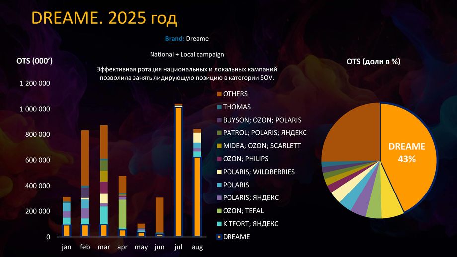 На ТВ: фактическое количество контактов с нашей рекламой (OTS) на 100% больше планового. Доля аудитории видевшей ролик как минимум 5 раз на 70% выше плановой (25,23% против 16,5%). Фактическая средняя частота контакта превышает 7, в то время, как по плану – выше 4.